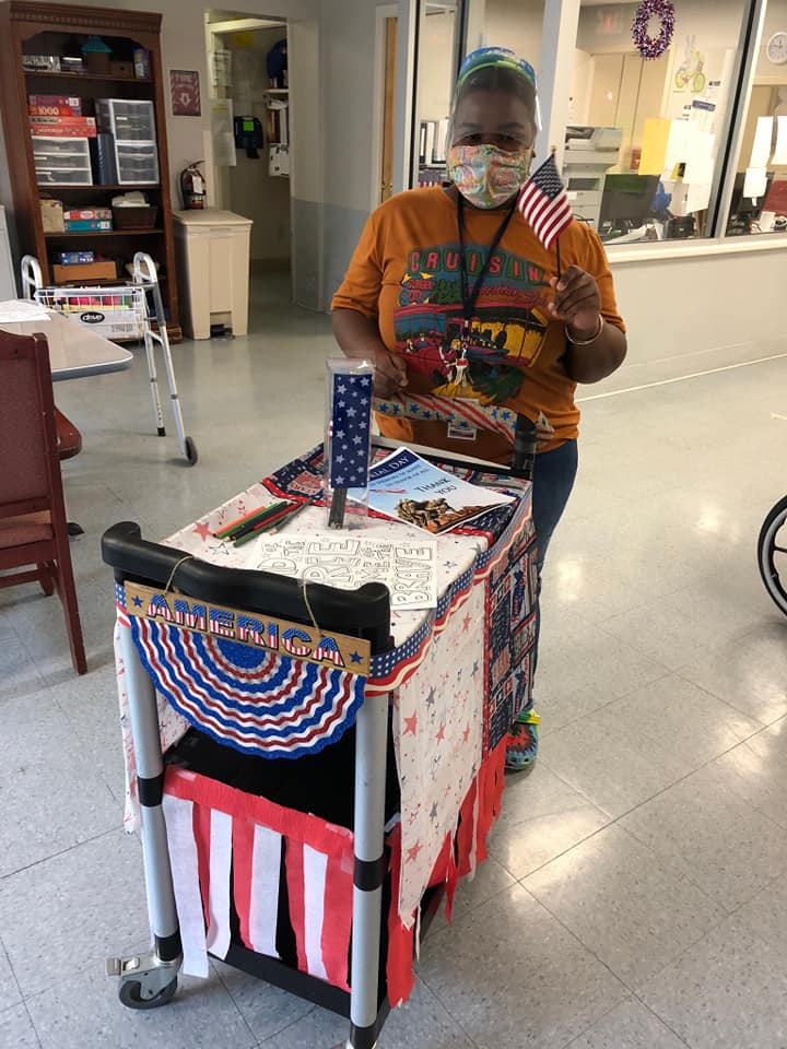 Heatherwood Rehabilitation and Health Care Center’s staff decorated a cart with red, white, and blue. This cart was used to deliver American flags to the residents and patients to celebrate Memorial Day. The residents and patients were able to pose with the flags for pictures that were uploaded to Facebook.